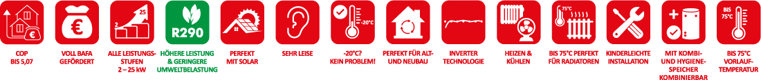 Ideal für Altbau: Vorlauftemperatur bis 75°C. Damit ist die Beheizung mit Radiatoren möglich. Dazu bieten wir Hohe Leistungsklassen an bis 25 kW.